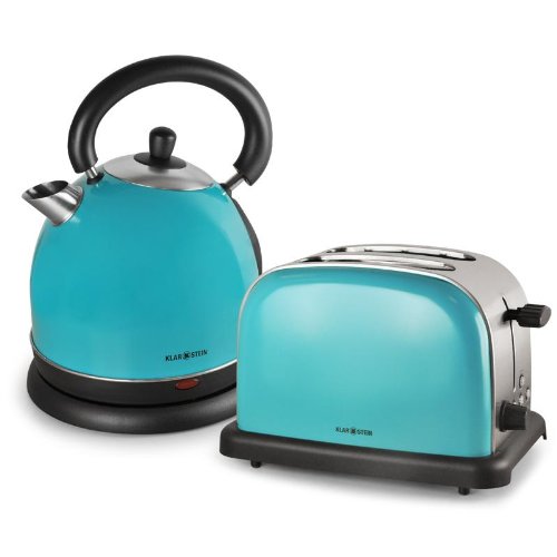Das Frühstücks Set "Bed and breakfast small türkis" ist mit einen charmanten Wasserkocher und Multifunktions-Toaster zur Herstellung eines einladenden Frühstücks geeignet. Liebenswürdiges Klarstein "Bed and breakfast small türkis" 1.0 Frühstücksset mit zeitloser,charmanter Formensprache im Retro-Look. Die Außenhüllen der Geräte bestehen großflächig aus rostfreien Stahl und sind farblich gut aufeinander abgestimmt. Der Wasserkocher Klarstein WK-ZD-8 kann mit 1,8 Litern Füllmenge und 2200W Leistung Tee- und Kaffeegenießer gleichermaßen überzeugen. Mit den Klarstein 2-Schlitz-Toaster kommen zudem Singles und kleine Familien voll auf Ihre Kosten. Die optische Homogenität des Sets und die türkise Farbgebung sorgen jeden T...